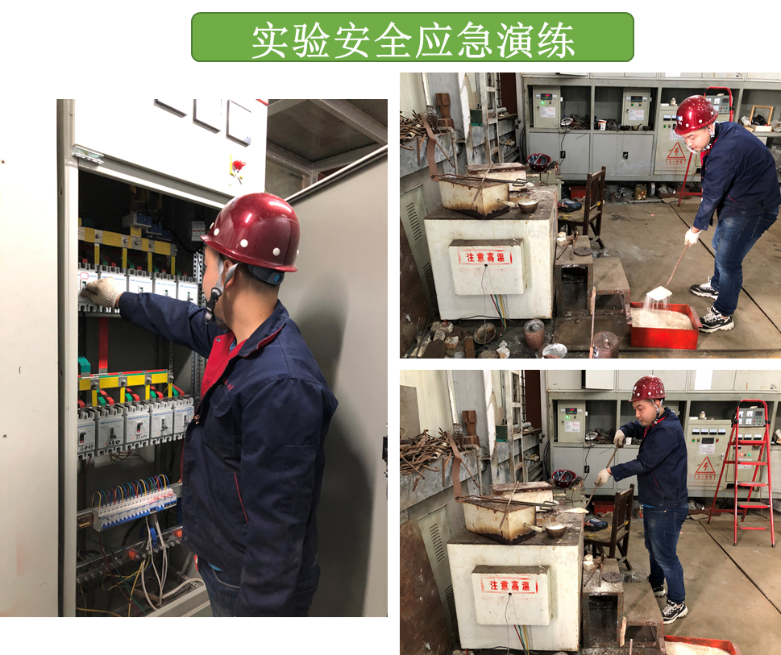 2020年9月23日上午9:00,课题组全体成员聚集在实验室厂房一楼的镁合金熔铸区域参加实验安全综合培训。大家都穿戴好工作服与安全帽,拿着课题组准备的安全培训资料,认真地参加培训。乐老师首先介绍了实验安全的重要意义以及学校和实验的安全相关规定;接下来针对课题组常用的一些设备,乐老师分别介绍了使用时的注意事项;最后,乐老师讲述了很多之前老师、学生和工厂中出现安全事故的例子,强调实验安全是头等大事。接下来那老师根据自己几十年的经验,向大家介绍了实验中容易出现的失误和安全问题。最后课题组进行了熔炼着火和热处理炉短路断电的应急演练。