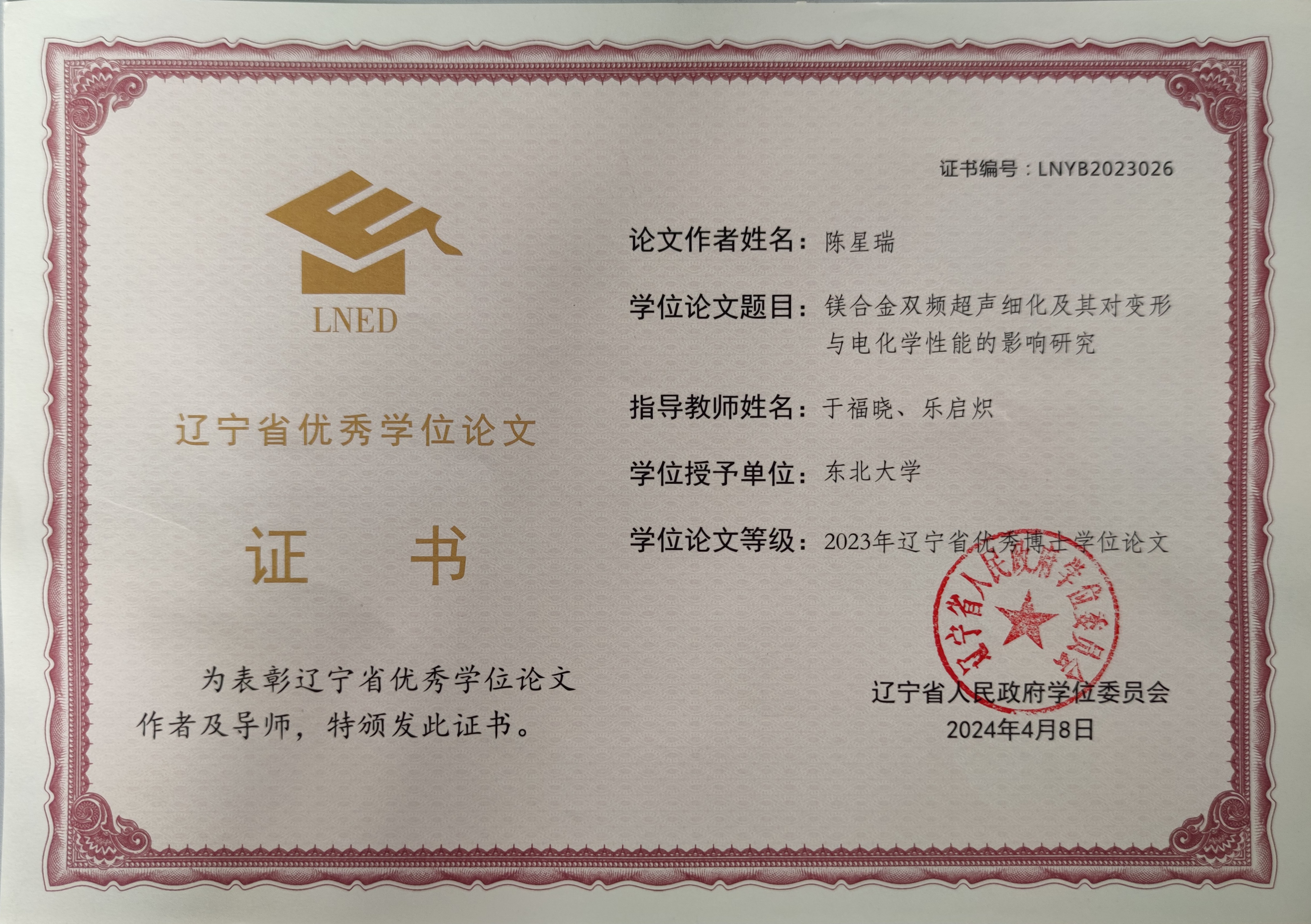 近日,辽宁省教育厅下发《关于公布2023年辽宁省优秀博士、硕士学位论文评选结果的通知》(辽教通[2024]4号),东北大学获评12篇省优博士学位论文。我实验室乐启炽教授实际指导的陈星瑞同学的博士学位论文《镁合金双频超声细化及其对变形与电化学性能的影响研究》是我校材料科学与工程学科获评的两篇省优论文之一。