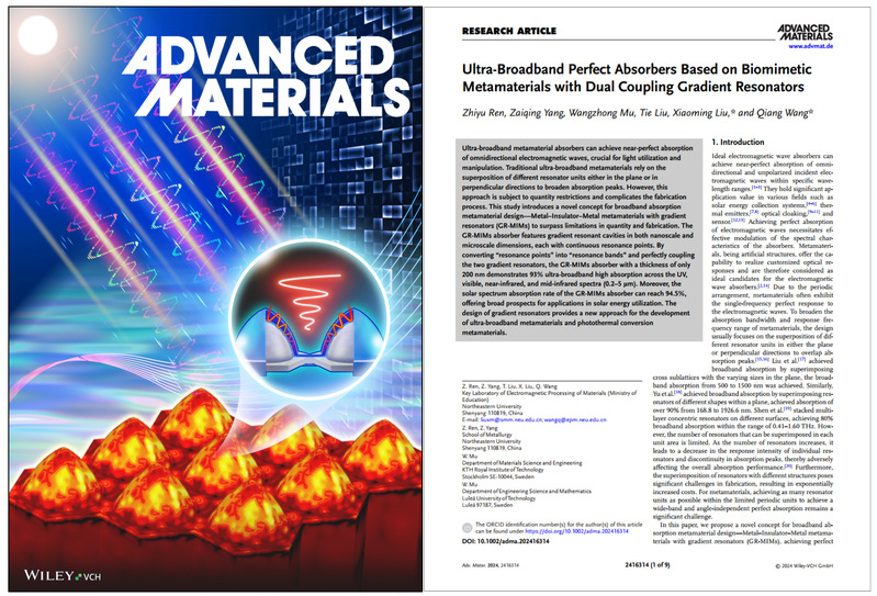 近日,东北大学王强教授团队在太阳能光热利用宽频吸波超材料领域取得重要研究进展。相关成果以“Ultra-Broadband Perfect Absorbers Based on Biomimetic Metamaterials with Dual Coupling Gradient Resonators”为题被国际权威学术期刊Advanced Materials(影响因子27.4)封面文章重点报道。东北大学为该论文的第一作者单位,东北大学冶金学院博士研究生任志宇为第一作者,刘晓明副教授与王强教授为共同通讯作者。