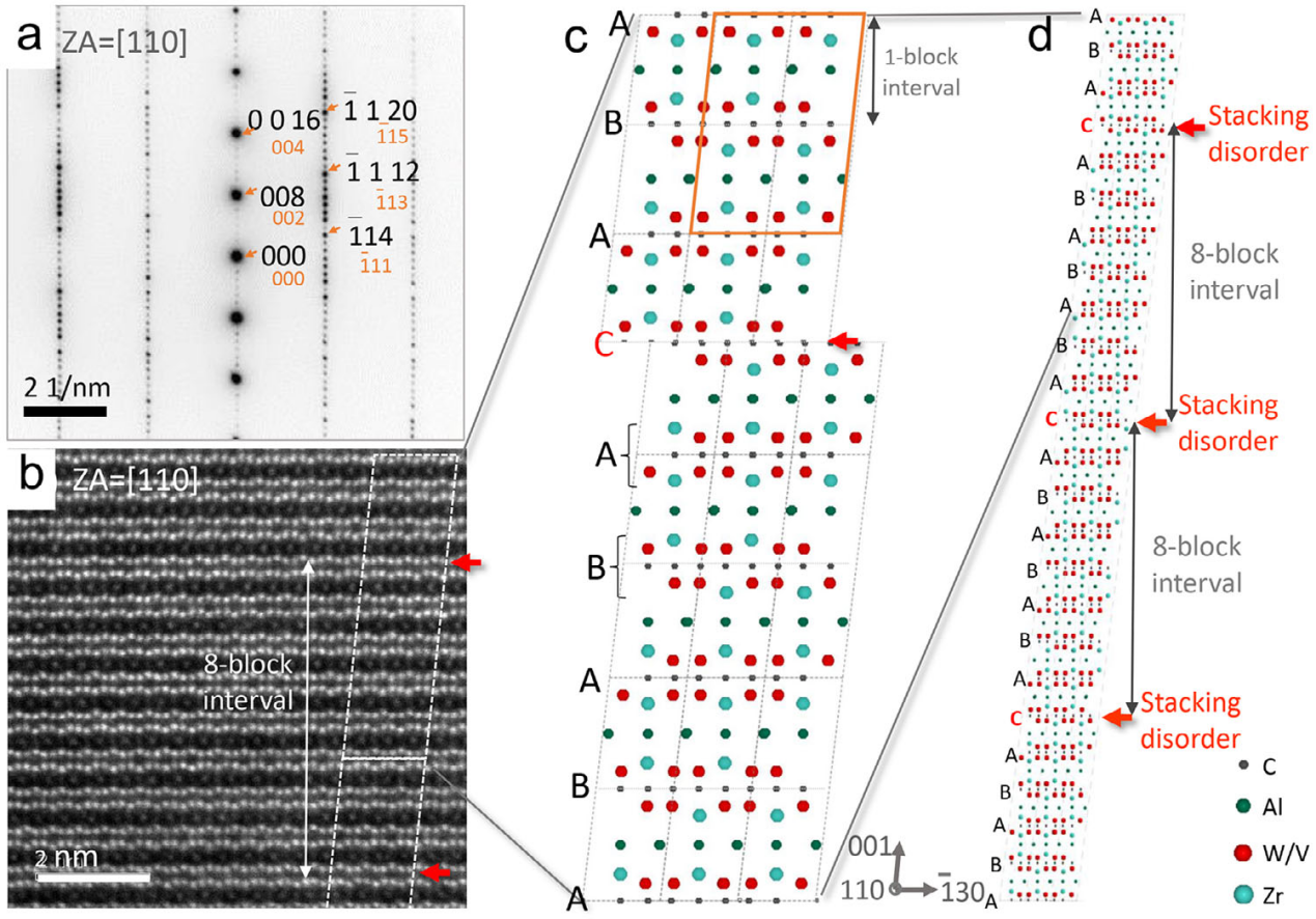 图1. (V0.6W0.4)4/3Zr2/3AlC的TEM研究。a) 与普通单斜C2/c结构的SAED图样相比,沿ZA = [110]方向的SAED图样具有额外的衍射斑点;b) 相对应的原子分辨率 STEM-HAADF 图像; c)白色虚线平行四边形内的原子模型;d) 扩大的原子模型显示了周期堆垛有序。