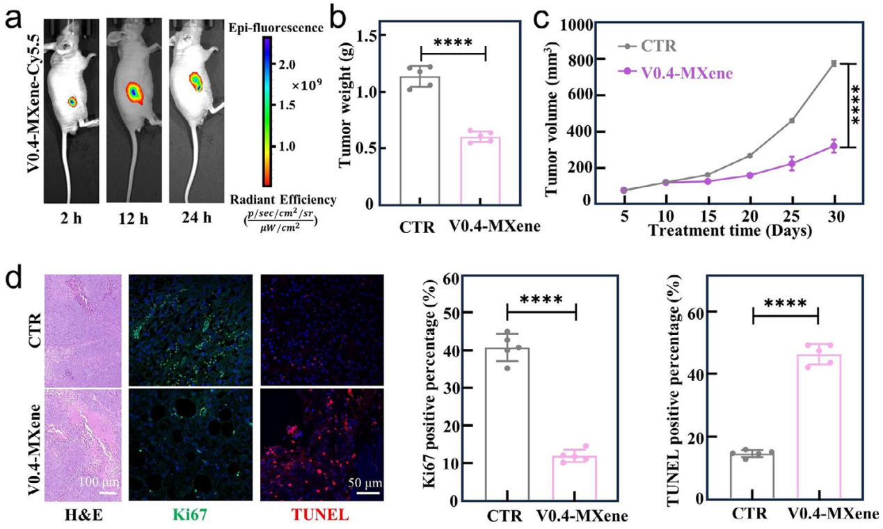 图3. V0.4-MXene对HCC-LM3小鼠模型的体内治疗评估:a) 静脉注射V0.4-MXene-Cy5.5后不同时间点的活体荧光成像(展示材料在肿瘤部位的富集情况);b) 肿瘤重量统计分析;c) 肿瘤体积随时间变化的生长曲线;d) 不同处理组肿瘤切片的H&E染色、Ki67染色和TUNEL染色分析。