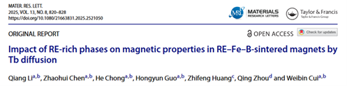 近日,东北大学EPM实验室崔伟斌教授团队在稀土永磁材料研究领域取得重要进展。相关成果以Impact of RE-rich phases on magnetic properties in RE-Fe-B sintered magnets by Tb diffusion为题,在国际知名期刊Material research letters发表。东北大学为该论文的第一完成单位,材料科学与工程学院博士研究生李强为第一作者,EPM实验室材料物理学科崔伟斌教授为本文通讯作者。我校分析测试中心为本研究提供有力支撑。