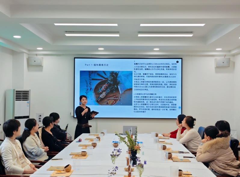 轻松愉悦的氛围中,老师们开启了一场独特的“植物疗愈”之旅。疗愈师首先为大家讲解了植物精油的历史渊源与疗愈功效,并逐一介绍了各类植物的特性与作用。在引导下,大家通过嗅闻植物的天然香气,感受生命成长的蓬勃力量;将植物香气融入烛光,唤醒内在能量,暂时忘却了科研数据的纷扰与日常工作的疲惫。随后的冥想环节,伴随着轻柔的音乐与引导语,大家闭目静坐,专注于一呼一吸,让心灵在喧嚣中得到深度的休憩与滋养。